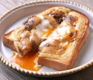 チーズみそ漬黒胡椒は、溶けやすいように細かく切る。 食パンにバターを塗り、四辺にマヨネーズで囲む。 ②の中央に鶏卵を割り入れる。 ③の上に、①のチーズを全体的に散らす。 オーブントースターで、チーズがとろけるまで焼く。